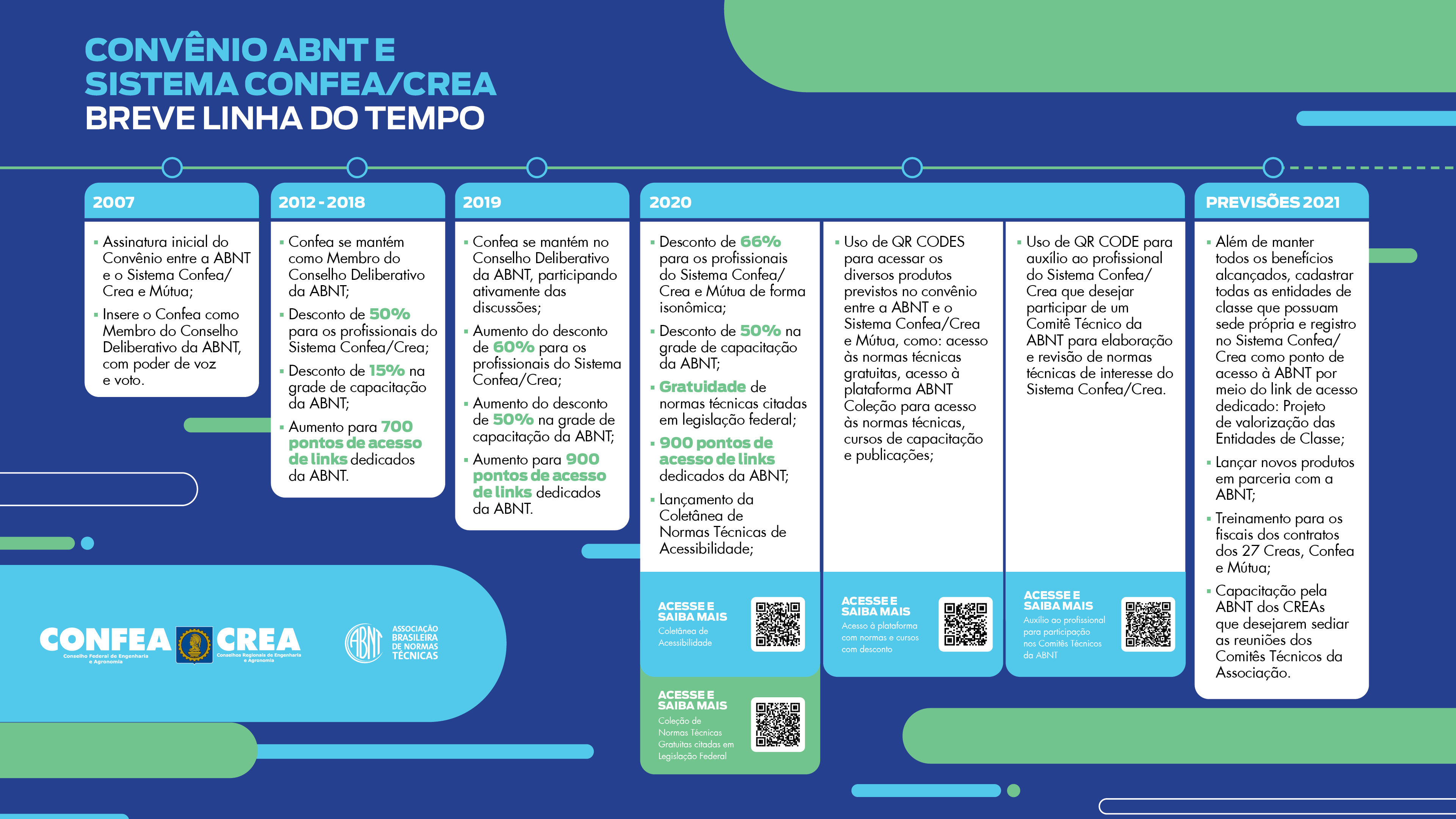 Antes de passar a palavra ao presidente da ABNT, Krüger apresentou breve histórico dos diversos convênios já celebrados entre o Confea e a ABNT, conforme linha do tempo abaixo. Entre as ações do próximo ano, Krüger destacou a intenção de se treinarem os funcionários dos Creas que responderão pela fiscalização do contrato.