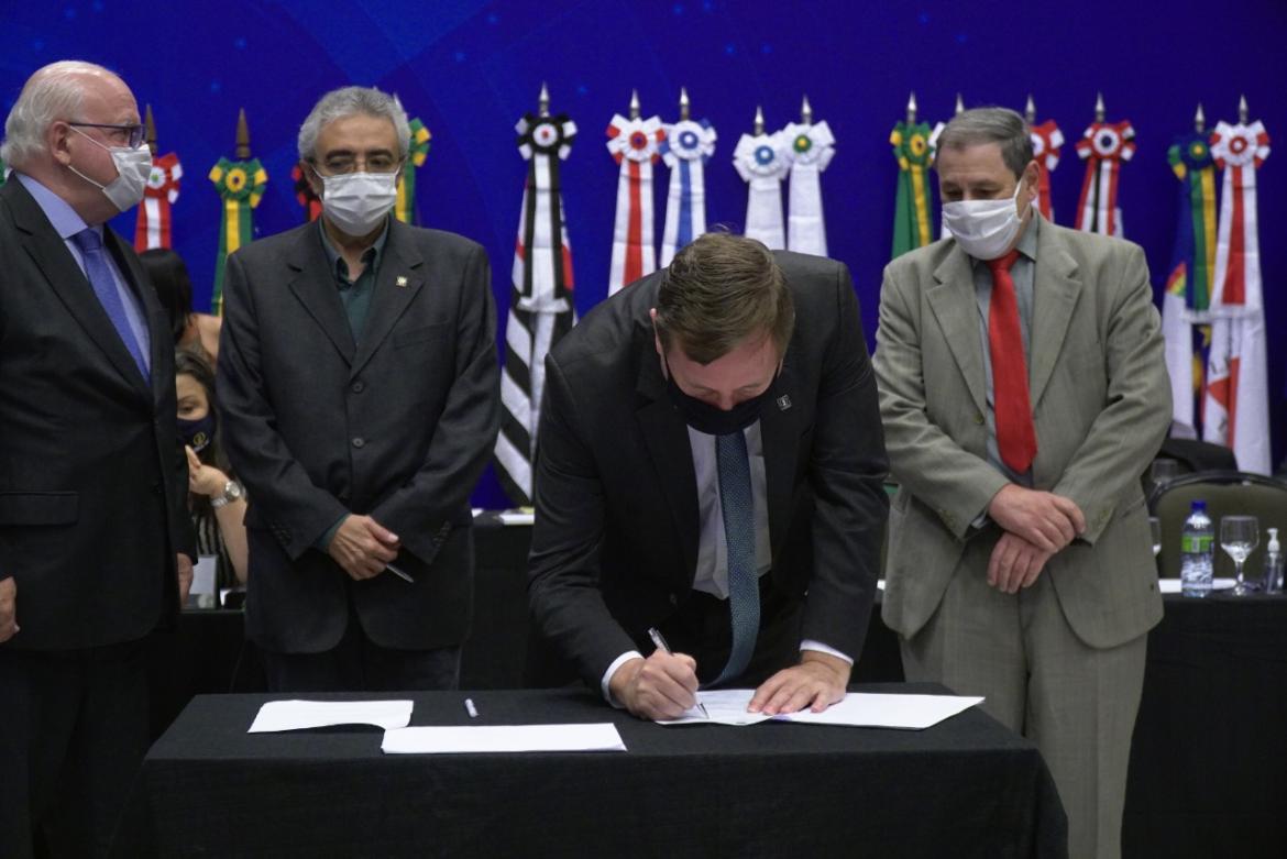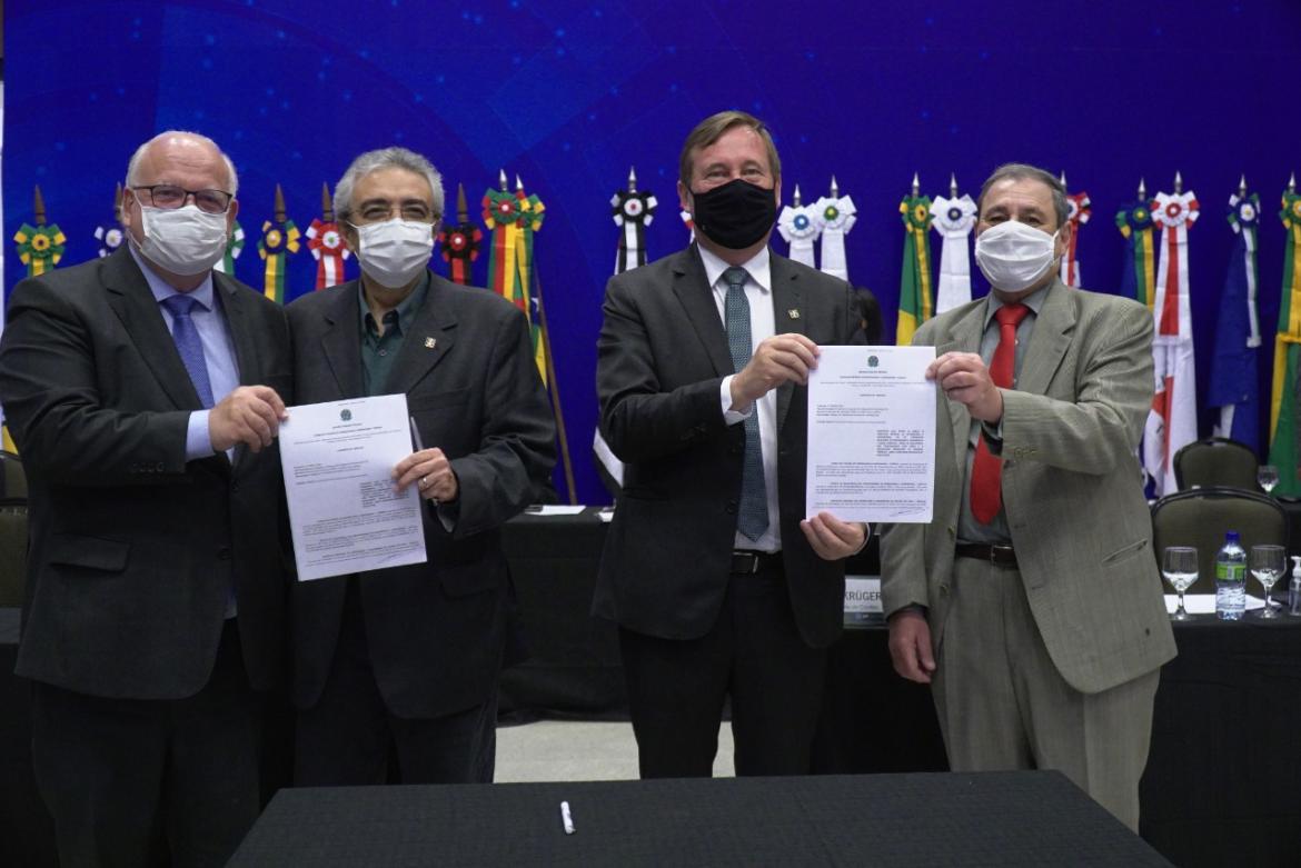Os presidentes do Confea, da Mútua, dos Creas e da Associação Brasileira de Normas Técnicas (ABNT) assinaram, na manhã desta segunda-feira (30/11), a renovação do convênio entre as instituições que, entre outras medidas, concede desconto aos profissionais registrados no Sistema Confea/Crea e Mútua quando da aquisição de normas técnicas. Neste ano, o desconto negociado ficou de 66% (no ano passado esse valor era de 60%). A solenidade de assinatura foi realizada durante a abertura da sexta reunião do Colégio de Presidentes do Sistema Confea/Crea e Mútua, a última de 2020.