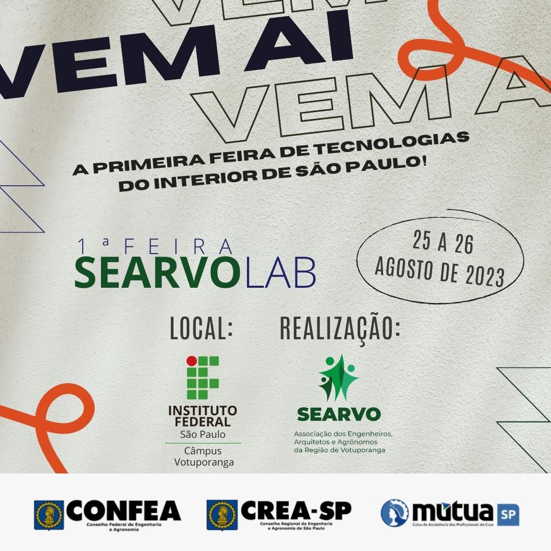Com uma programação que valoriza a diversidade da sua atuação, a Associação dos Engenheiros, Arquitetos e Agrônomos da Região de Votuporanga-SP (Searvo) promove a partir desta sexta-feira (25/08), a 1ª Feira SearvoLAB. “Estamos preocupados com a inovação de tendências, tecnologias e metodologias e por isso nossas feiras tradicionais estarão agora denominadas assim, valorizando as áreas abrangidas pela Associação, mesmo que nesta não tenha o caráter de feira mesmo, e sim de um ciclo de palestras, devido à reforma da nossa sede”, diz o presidente da entidade, eng. civ. Rafael Salerno, informando que o evento será realizado durante dois dias no campus do Instituto Federal de São Paulo, um dos patrocinadores da iniciativa, ao lado do Confea, do Crea-SP e da Mútua-SP.