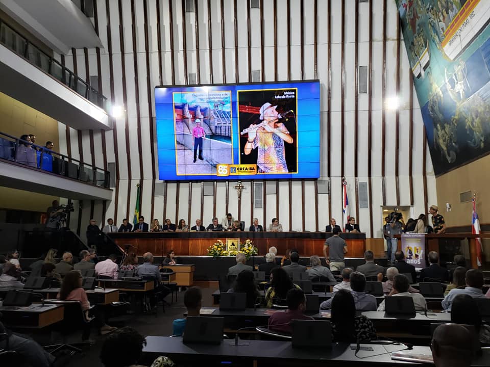 O Plenário da ALBA ficou lotado e a cerimônia foi aberta com o hino nacional brasileiro cantando pela engenheira civil Jamile Nogueira. Em seguida, foi apresentado um vídeo que contou a história do Crea, desde suas primeiras sedes no centro de Salvador, até a chegada em 2019. Outro momento marcante da solenidade foi a fala do servidor Francisco Santa Bárbara, que narrou as evoluções da instituição nas últimas décadas e, de forma emocionante, declarou o seu amor pelo Crea. O encerramento ficou por conta do engenheiro eletricista e de segurança do trabalho Geraldo Ferreira, que fez uma apresentação artística tocando solo de flauta. Além de engenheiro e servidor do Crea-BA, Geraldo é artista e neste cenário conhecido como “Lahu da Flauta”.
