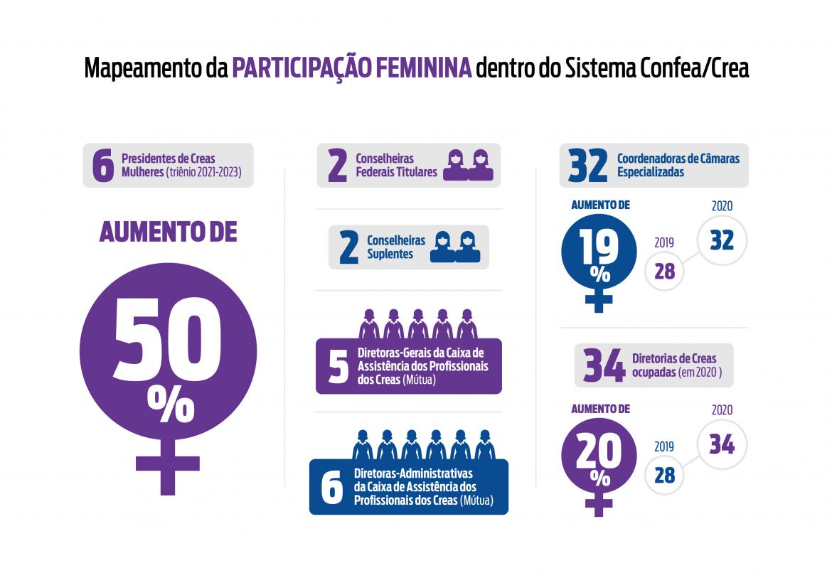 Já empossadas, as novas presidentes somam-se ainda a outras lideranças femininas do Sistema, comprovando o incremento na participação feminina do Sistema, desde a criação do Programa Mulher, conforme apurado após as eleições gerais do final de 2020, quando houve a eleição de duas conselheiras federais titulares e duas conselheiras suplentes, além de cinco diretoras-gerais e seis diretoras-administrativas da Caixa de Assistência dos Profissionais do Crea (Mútua). Conforme a equipe de comunicação do Confea registrou então, a proporção de mulheres eleitas para presidente de Crea é maior do que a proporção de mulheres no Sistema, pois equivale a 22%. A proporção de mulheres registradas, conforme o SIC é de 18,7%, totalizando cerca de 182 mil mulheres de um total de 975 mil profissionais registrados no Sistema de Informações Confea/Crea (SIC), no início de novembro. Confira outros dados na reportagem.