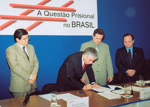 Brasília, terça-feira, 1 de outubro de 2002. O Ciclo de Palestras sobre a questão prisional no"Dalmi Rodrigues" Brasil foi aberto na noite de segunda-feira (30/10), no auditório do Confea, com a apresentação do vídeo "O Espaço do Preso", uma mostra da atual situação dos complexos penitenciários do país como Bangú do Rio de Janeiro, Presídio Central de Aracajú, Presídio da Glória de Sergipe, Presídio Central de Porto Alegre, entre outros. O vídeo deixa claro a situação de caos em que se encontram os presídios hoje, onde condições básicas como espaço físico, higiene, luminosidade, ventilação, número adequado de presos por cela, atividades ocupacionais e outras, necessárias para uma possível recuperação do preso, não existem. "Hoje há superlotação, não existe um olhar para a recuperação dos presídios que são depósitos de seres humanos", disse Ângelo Roncalli de Ramos Barros, diretor do Departamento Penitenciário Nacional, um dos entrevistados na fita.Em seguida foi apresentado um resumo do convênio assinado entre o Confea e o Ministério da Justiça, no qual se insere a realização do ciclo de palestras. O convênio de cooperação técnico-científica e operacional foi assinado no dia 23 de outubro do ano passado, entre o presidente do Confea eng. Wilson Lang e o Ministro da Justiça, à época, José Gregori. O objetivo do acordo é buscar soluções para que as edificações prisionais sejam construídas de maneira inteligente, ou seja, proporcionando segurança à sociedade e possibilidades de recuperação ao preso.Na abertura do Ciclo de Palestras Lang ressaltou que o Sistema Confea/Crea recebeu com muita seriedade o convite do Ministério da Justiça para somar na busca de soluções para problema tão complexo e dramático. "As soluções não estão disponíveis, precisam ser construídas junto com a sociedade. Sabemos que os desafios são grandes, mas o Confea e as Entidades de Classe tudo farão para contribuir", enfatizou.O Ministro da Justiça Paulo de Tarso Ramos Ribeiro disse que o convênio busca apoio junto à comunidade científica para discutir o tema porque entende que hoje, um dos maiores desafios da sociedade brasileira, é enfrentar os presos de frente. "Os presídios têm que superar a dicotomia do lugar comum: casa de horrores ou escritório do tráfico. De uma forma ou de outra não cumprem seu objetivo que é abrigar o preso no cumprimento de uma pena, período em que deve ser recuperado", explicou.Paulo de Tarso ressaltou que o convênio busca produzir um modelo de presídio que alie segurança à recuperação dos presos. "Será um desafio muito grande porque uma característica está ligada ao confinamento e a outra à liberdade", constatou.O Ministro enfatizou: "Foi na perspectiva da confiança no humano, da confiança na criatividade arquitetônica da arquitetura e da engenharia brasileira que solicitamos esse apoio. Na concepção arquitetônica estará a própria concepção da pena".Na abertura do evento foi assinada pelo presidente do Confea e o secretário do IAB Nacional, arquiteto Gilson Paranhos, a contratação do Instituto para a coordenação do Concurso Público Nacional de Arquitetura para um Edifício Prisional Modelar de Segurança Máxima. Bety Rita Ramos -Da equipe da ACS